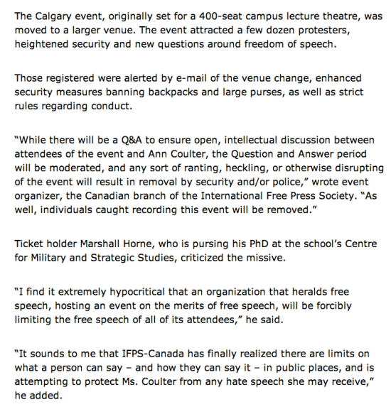 The rules laid out for attendees of the Coulter event in Calgary demonstrate who’s ‘free speech’ Ezra Levant, Ann Coulter, and event sponsors International Free Press Society are seeking to defend…their own.